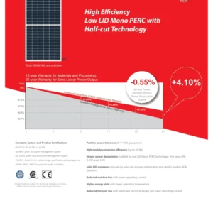 – Half-cut cells (Công nghệ giảm bóng che để tăng hiệu suất): Số lượng cell pin mặt trời (tế bào quang điện) hoạt động sẽ tăng lên gấp đôi, tức là từ 72 thành 144 cel pin trên trùng một tấm pin mặt trời. Công nghệ này giúp tấm pin mát hơn khi vận hành, hiệu quả chuyển đổi quang năng thành điện năng cũng cao hơn, tuổi thọ của pin cũng sẽ cao hơn so với loại pin không áp dụng công nghệ này.