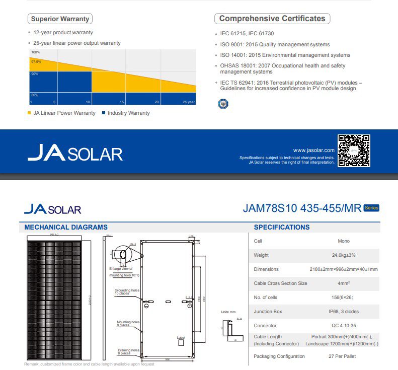 Datasheet tấm pin năng lượng mặt trời JA 450W JAM72S20-450MR